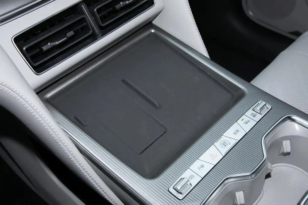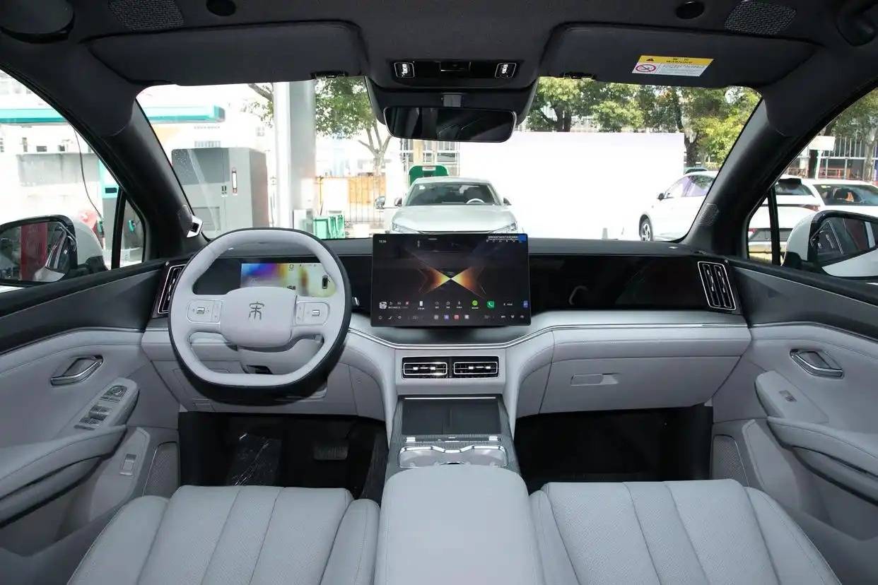 内饰方面,这款车所营造的豪华氛围和科技氛围还是很不错的,配备了10.25英寸液晶仪表盘+15.6英寸中控屏幕+26英寸W-HUD投屏,DiLink系统支持卫星导航、四区域语音识别控制、面部识别、5G车联网、手机APP远程功能和OTA升级等,前排还标配50W手机无线充电面板。