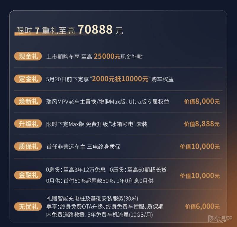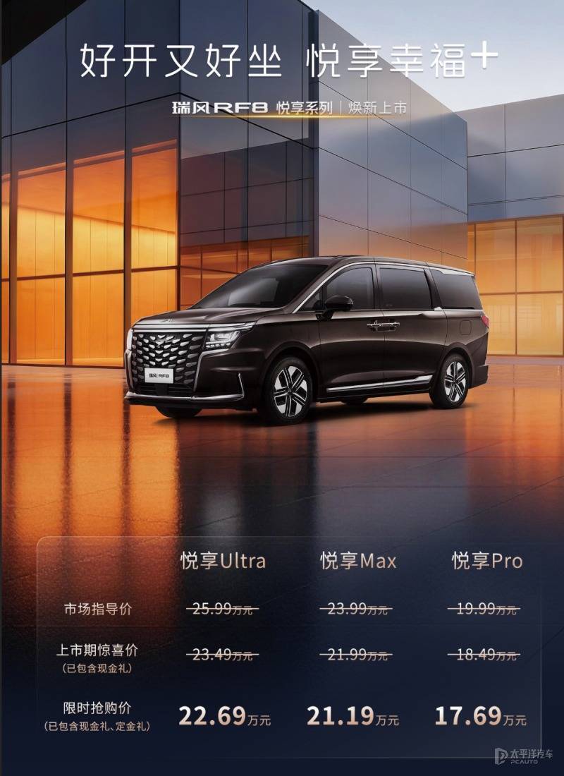 【太平洋汽车 新车频道】瑞风RF8悦享系列正式上市,三款车型的官方指导价区间19.99-25.99万元,限时抢购价区间17.69-22.69万元。同时官方还推出了致敬老车主权益,包括免费升级原厂精美车钥匙/HiCar智慧车生活(限智聆车机)以及1666元升级价值3888元的原厂NVH静音包。